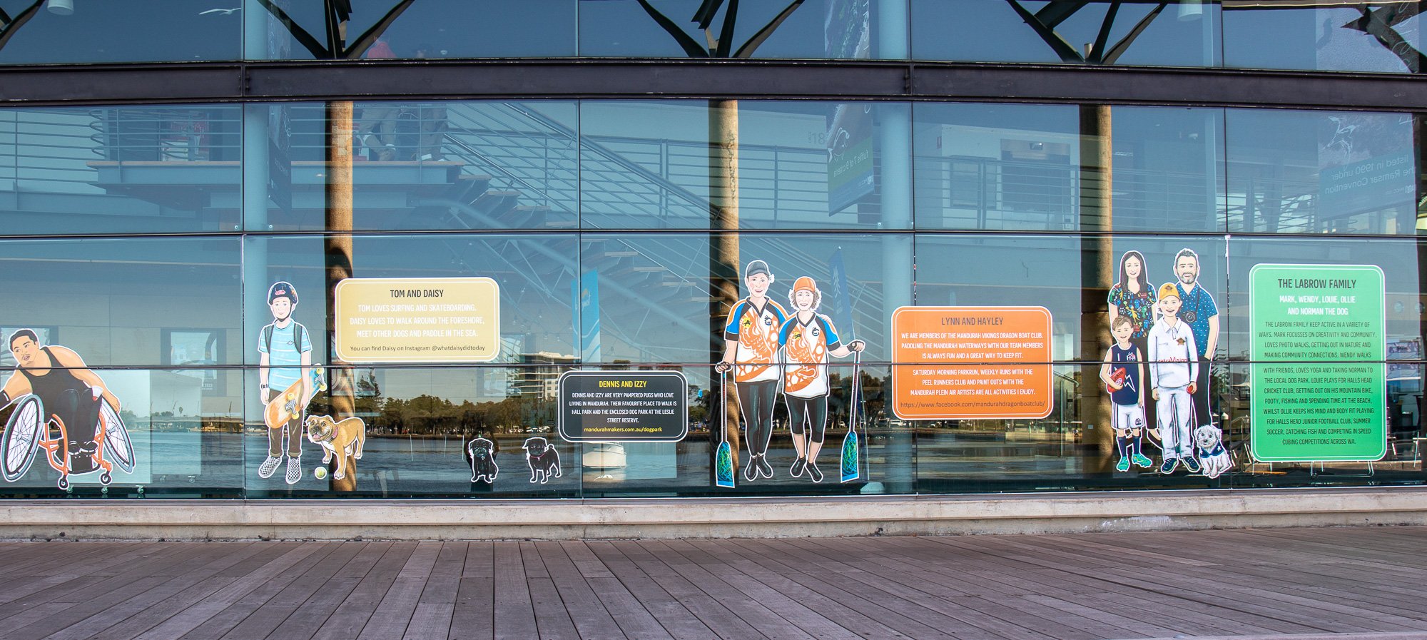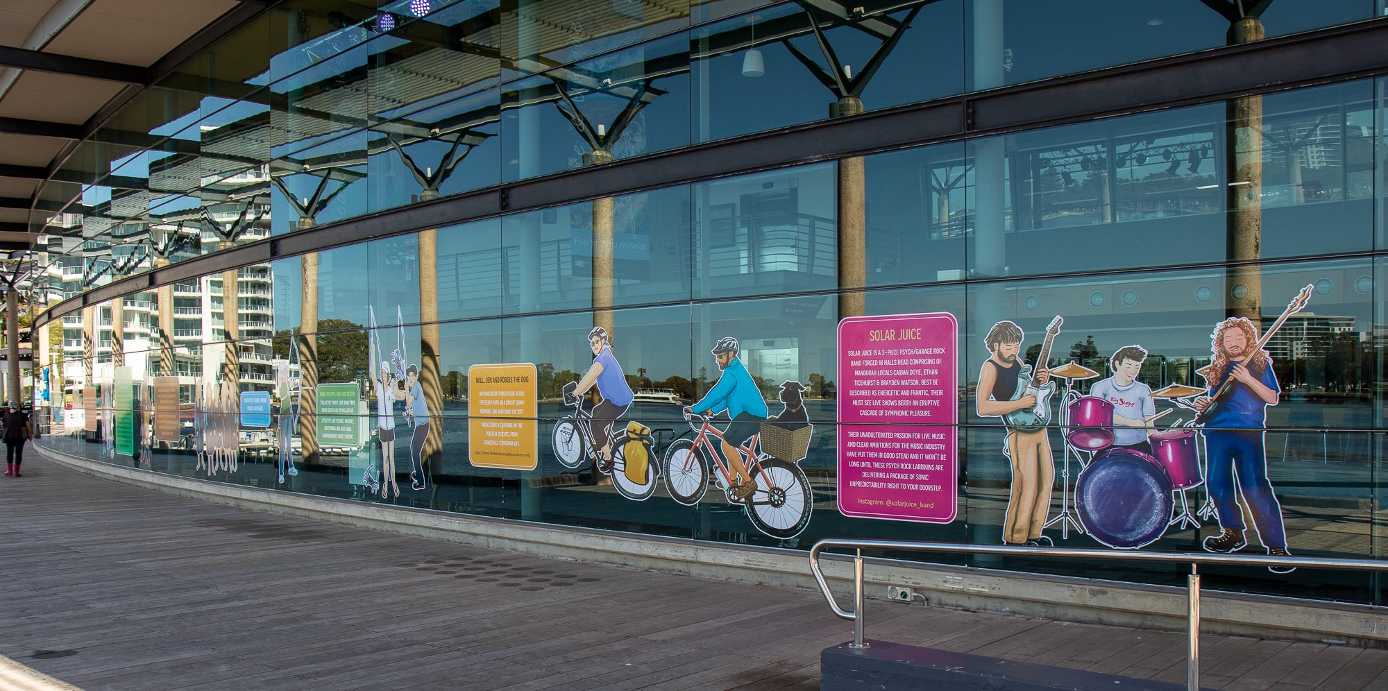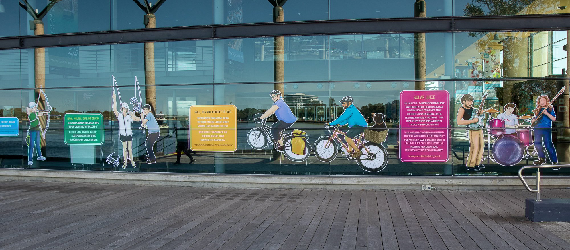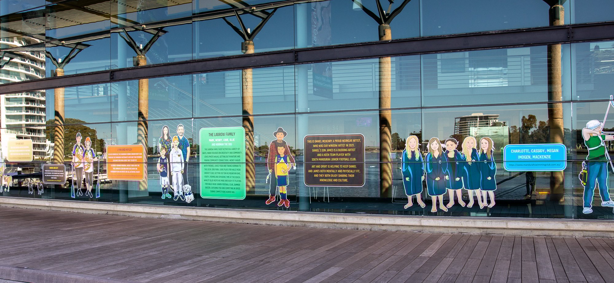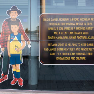 ElliĀ was commissioned to capture some of our colourful community members including Salty Daz, Twisted Shuffle, Solar Juice, Wiljen’s Adventures, Mandurah Swimming Club, Mandurah Dragon Boat Club, Persian Dance Classes, Mandurah Plein Air Artists (Inc), City of Mandurah, Visit Mandurah for our Spring 2022 window art installation entitled ‘Know Your Neighbourhood’.