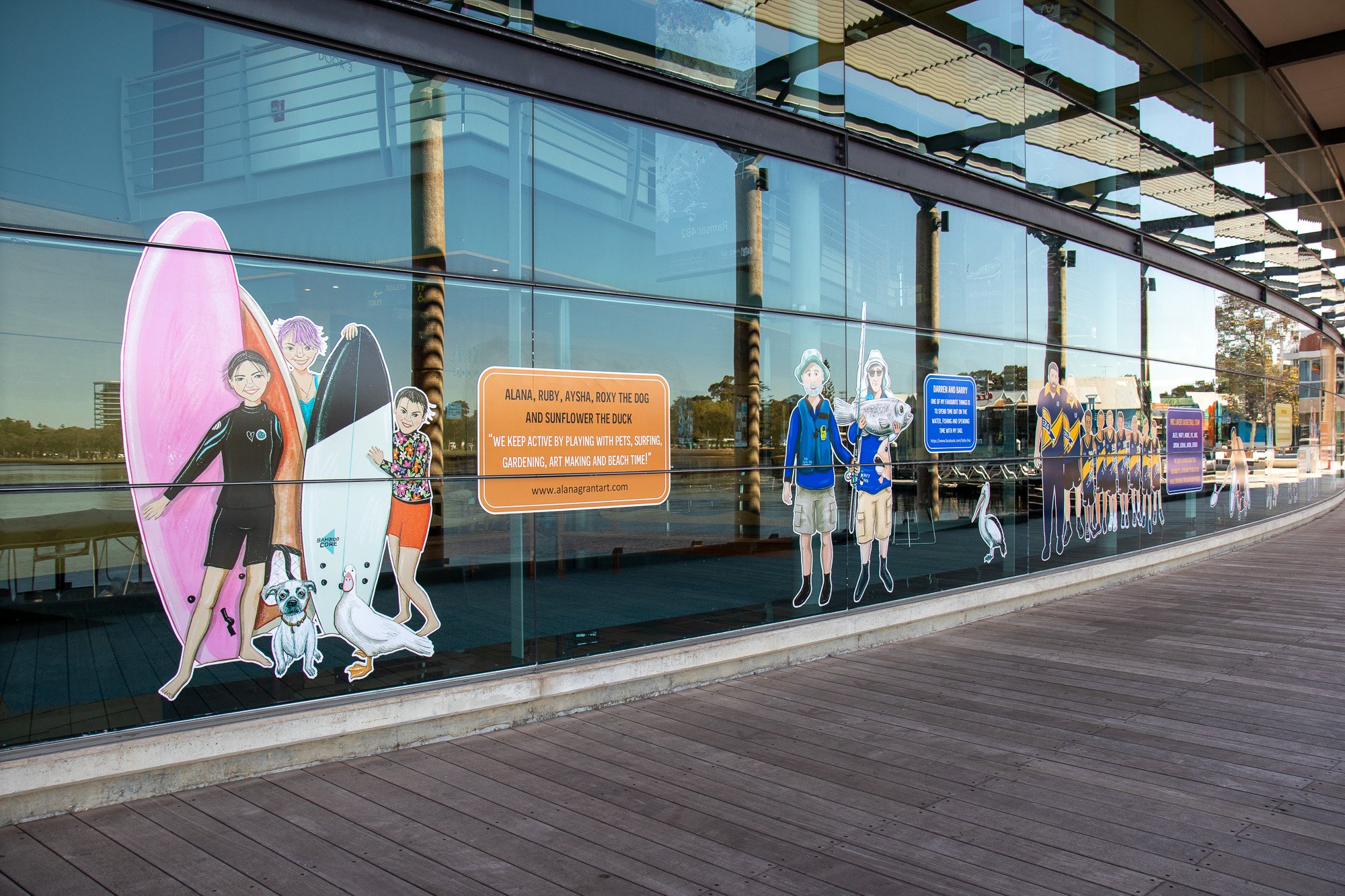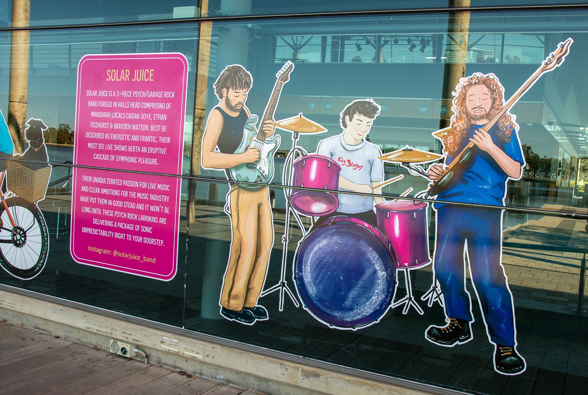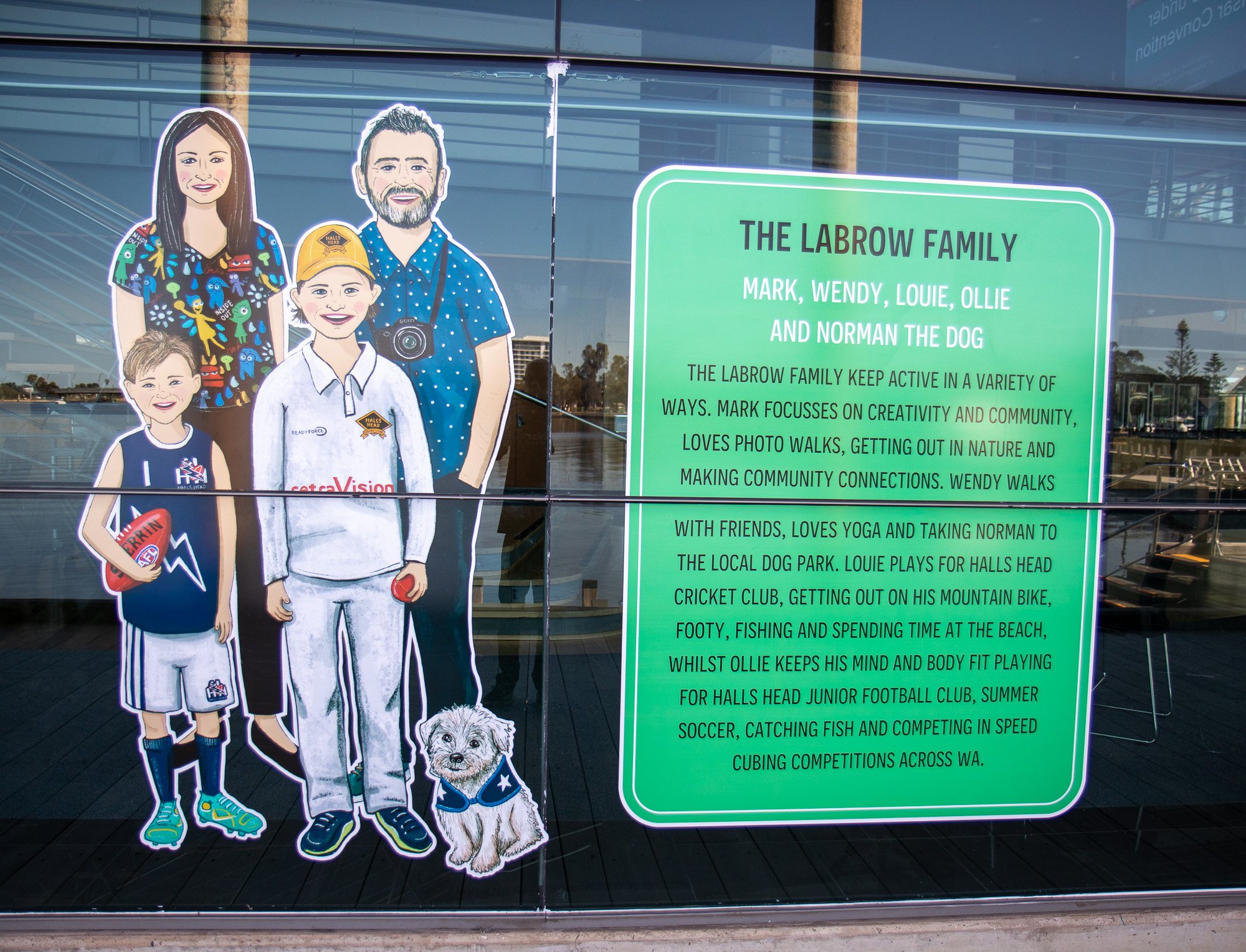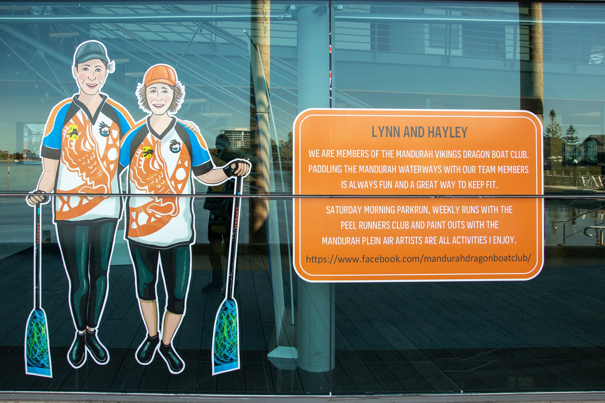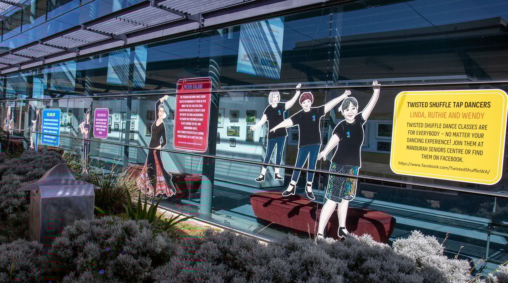 ElliĀ was commissioned to capture some of our colourful community members including Salty Daz, Twisted Shuffle, Solar Juice, Wiljen’s Adventures, Mandurah Swimming Club, Mandurah Dragon Boat Club, Persian Dance Classes, Mandurah Plein Air Artists (Inc), City of Mandurah, Visit Mandurah for our Spring 2022 window art installation entitled ‘Know Your Neighbourhood’.